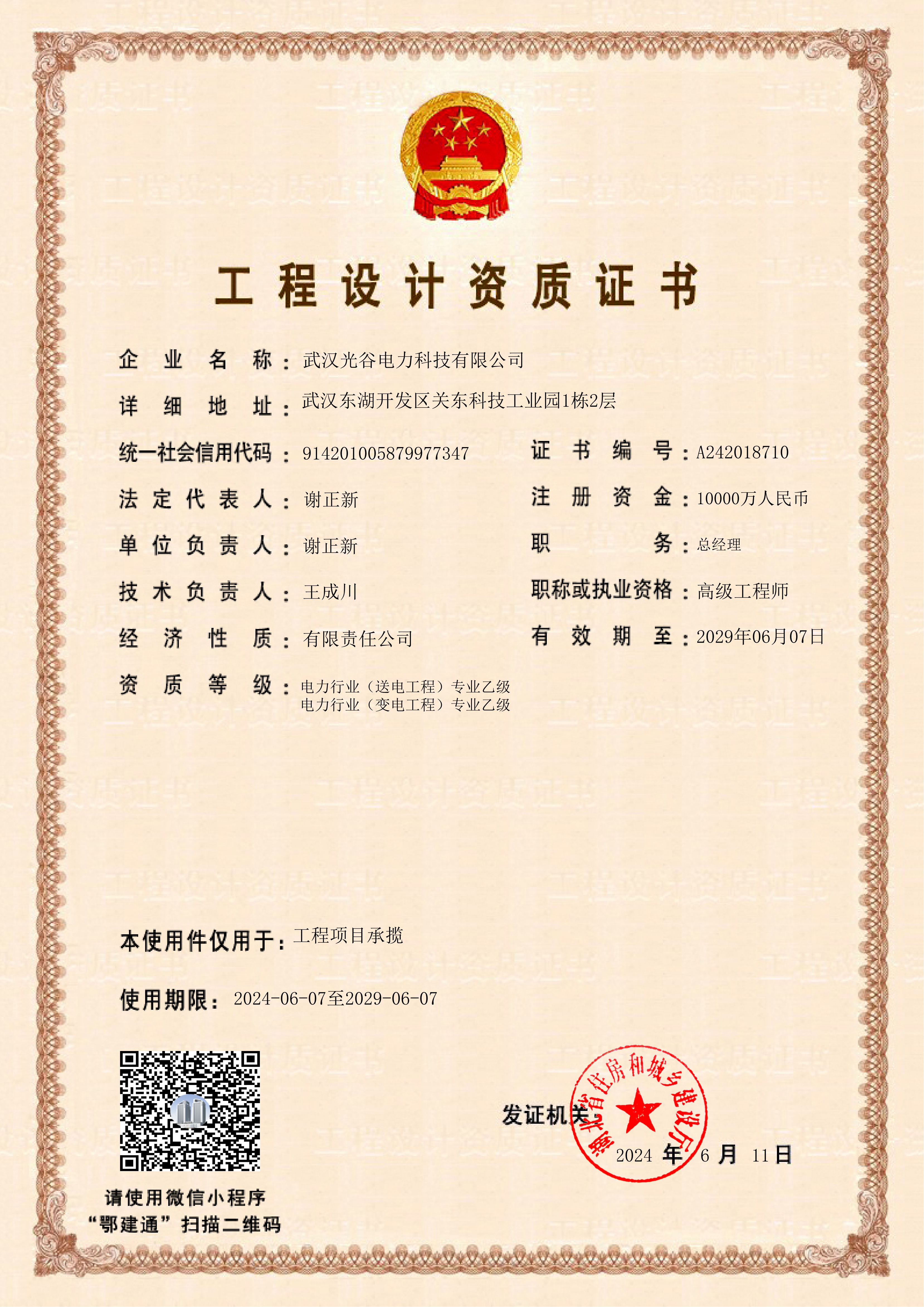 Our Power Engineering Company has the Grade II General Contracting for Electric Power Works Qualification, and can undertake the construction of power generation projects with a single capacity up to 200,000 kW, and up to 220kV class of transmission lines and sub-stations. We also have the Grade II Professional Contracting for Power Transmission and Transformation Works Qualification, and can undertake the construction of power transmission lines and sub-stations projects up to 220kV class. We have the Grade II Professional Contracting for Urban and Road Lighting Works Qualification, and can undertake the construction of urban and road lighting projects with a single contract up to 12 million yuan. The company also has the Grade II Professional Contracting for Building Mechanical and Electrical Installation Works Qualification, can undertake the installation of equipment, lines, pipelines, 10kV class of sub-stations works and non-standard steel structures in various type of building projects with a single contract up to 20 million yuan. We also have the Grade III License for Undertaking the Installation, Repair, and Test of Electric Power Facilities Qualification, can undertake the installation, repair, or test of electric power facilities up to 110kV class. Our Optics Valley Power Company has the Grade III Design for Power Transmission and Distribution Qualification, and can undertake the design of major and supporting works for small and medium construction projects.