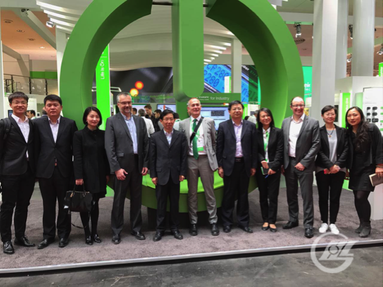 訪問團剛剛達漢諾威施耐德展廳,施耐德負責接待的官員就介紹,為了接待大家,我們已經收到了近千封工作郵件。施耐德全球營銷副總裁安德魯先生以及商業伙伴副總裁佩雷格林先生熱情地接待了董事長訪問團。雙方合影留念,并進行會談。