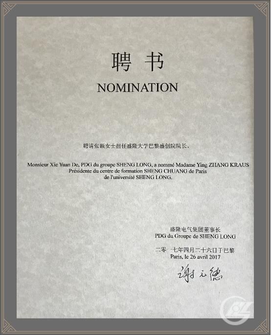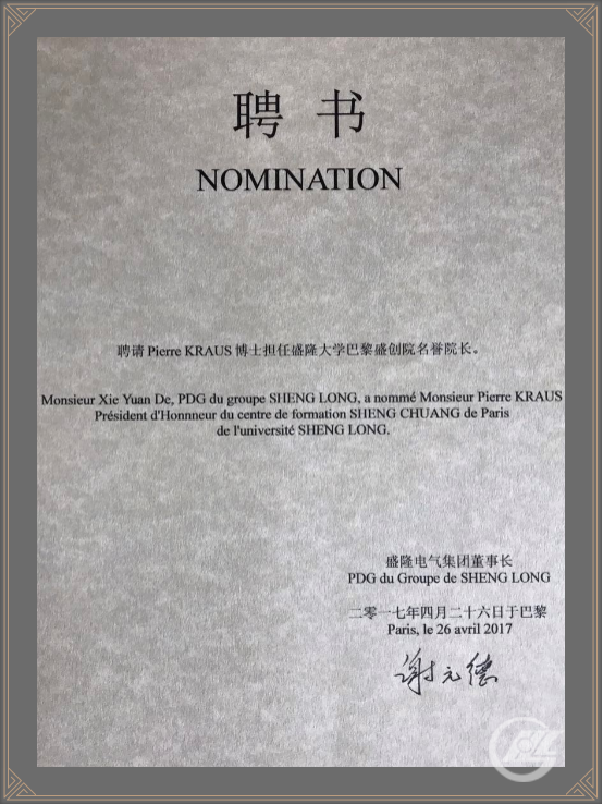 2017年4月26日,盛隆電氣集團巴黎盛創院成立。董事長簽發聘書:聘請皮埃爾·克勞斯(Pierre KRAUS)博士擔任盛隆大學巴黎盛創院名譽院長,聘請張穎女士擔任盛隆大學巴黎盛創院院長。