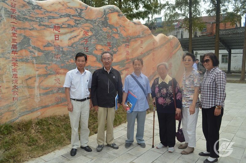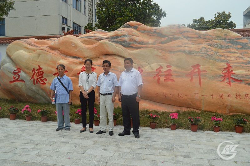 從左往右依次為:中南財經政法大學教授屈演文、王城鎮黨委書記李黎、盛隆電氣集團董事長謝元德、市委常委宣傳部長柯紅勇,在刻有校訓的紀念石前合影