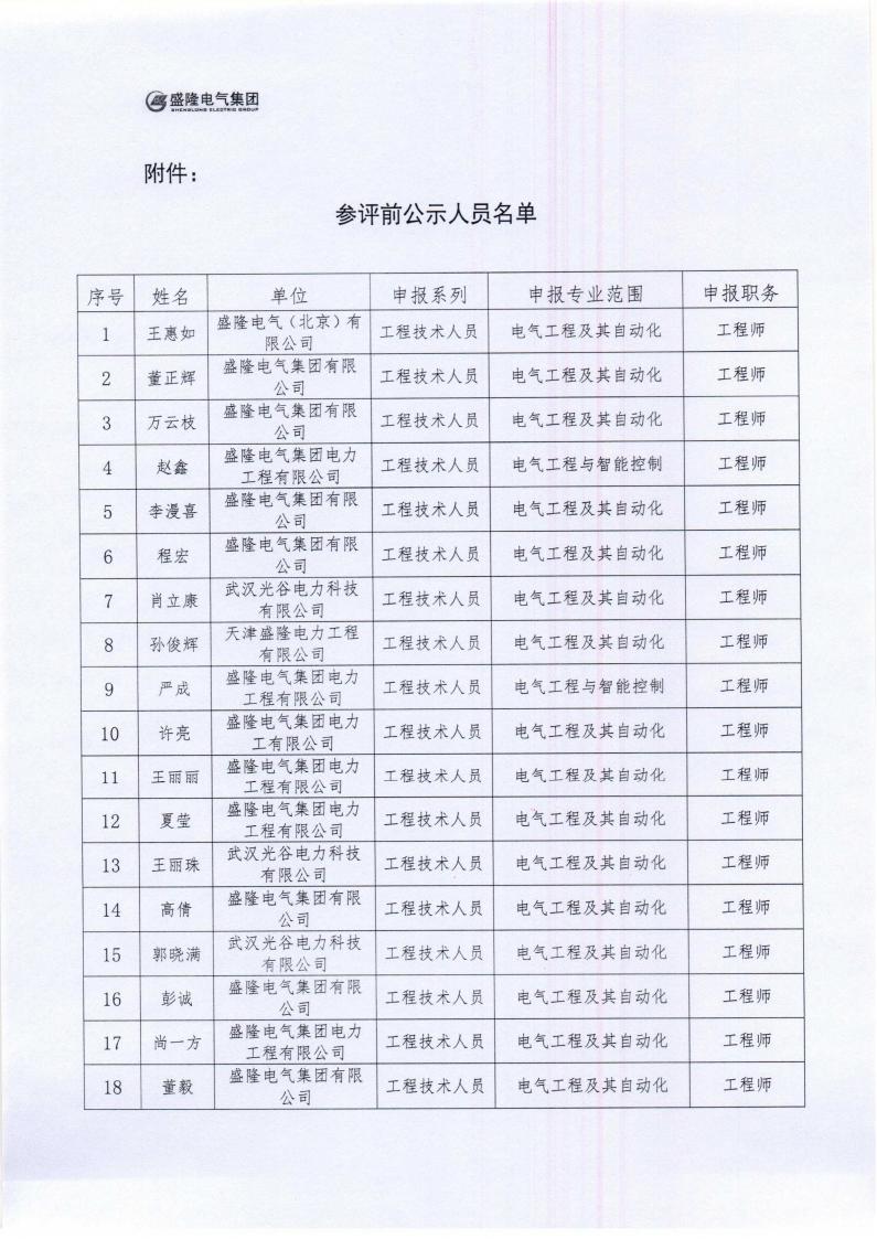 關(guān)于參加 2023 年度上半年盛隆電氣集團(tuán)電氣、機(jī)械專業(yè)技術(shù)職稱評審人員的評前公示