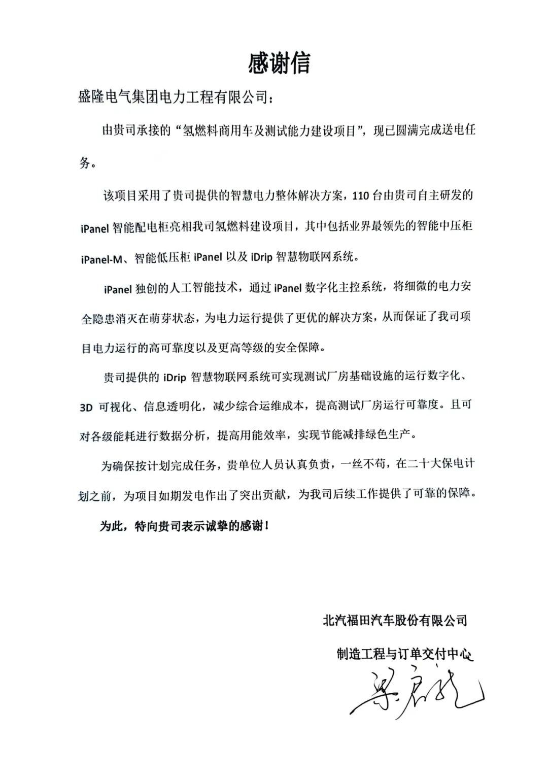 近日,北汽福田氫燃料建設項目順利送電,盛隆電氣為其提供個性化的智慧電力解決方案,并以“明星產品”iPanel智能配電柜和iDrip智慧物聯網系統的亮眼表現,以及扎實的技術和優質的服務,獲得了業主方、供電公司等單位的一致好評。業主方特別發來感謝信,對盛隆電氣表示高度認可和贊譽,并表示,此次順利送電,為其“二十大...2023-04-12 -